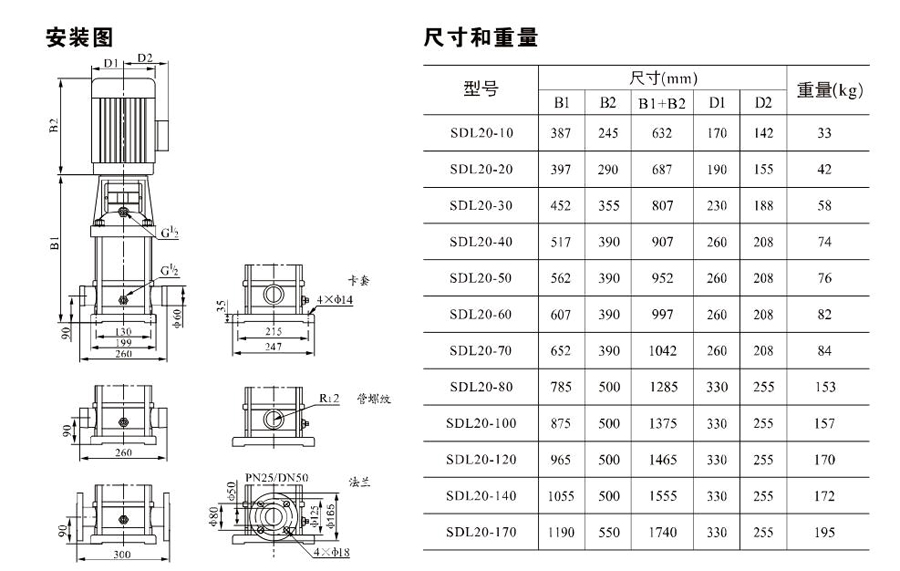 SDL20/SDLT20為配用標(biāo)準(zhǔn)電機(jī)的非自吸立式多級離心泵,電機(jī)軸和泵軸用聯(lián)軸器直接聯(lián)接,把拉桿用螺母將外筒,過流部件固定在支架和進(jìn)出水體之間,泵進(jìn)出水口在泵底部的同一直線上。泵可根據(jù)需要配置智能保護(hù)器,對泵的干轉(zhuǎn)、缺相、過載等進(jìn)行有效的保護(hù)。